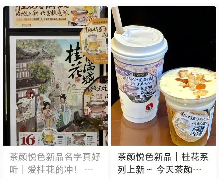说湖南茶饮怎么可能绕得开茶颜,今年秋天茶颜一口气上新了两款桂花系列的单品。一款名叫“欲买桂花同载酒”,另一款叫桂酿秋。这是一个国风+桂花结合十分有特色的品牌,两款刚刚面世就收获了许多尝新爱好者的夸奖。