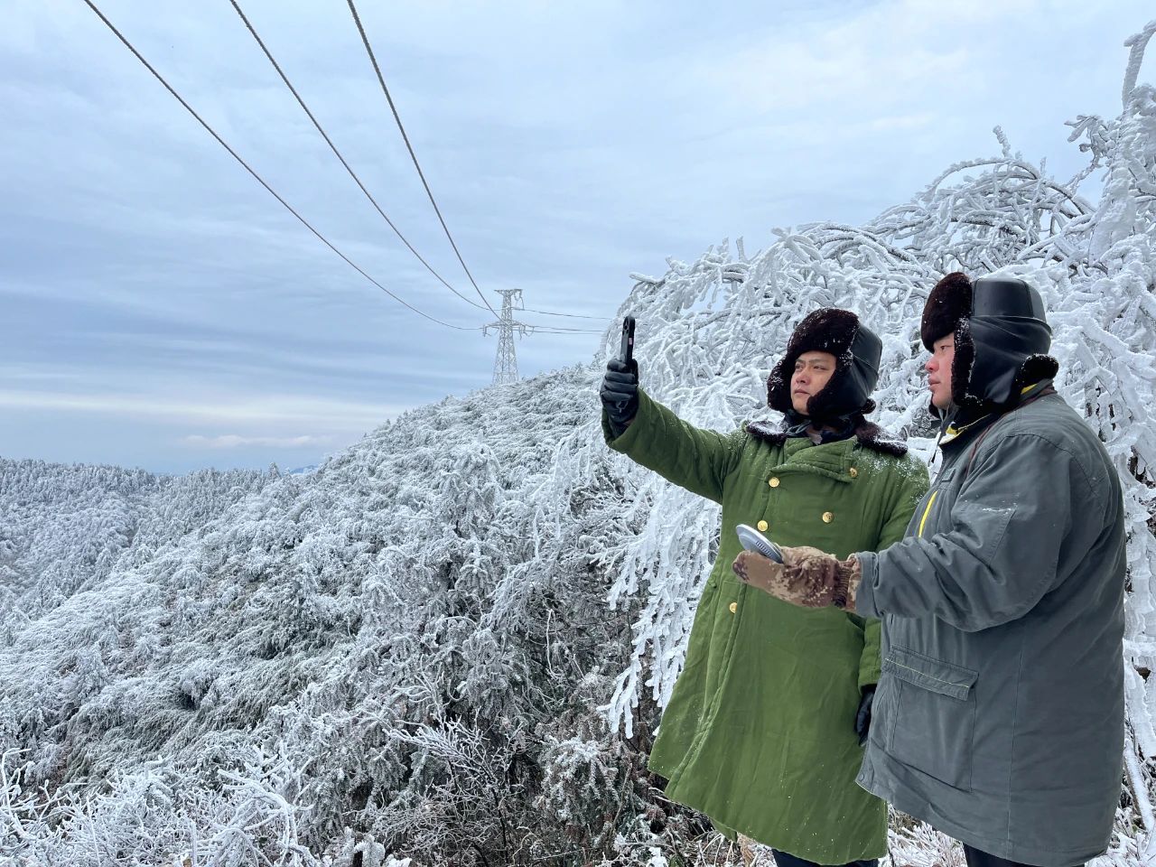 (12月16日,国网怀化供电公司冰情监测人员在110千伏西公线03号观测点进行融冰观测,确保线路直流融冰作业顺利进行。蒋叶子 摄)