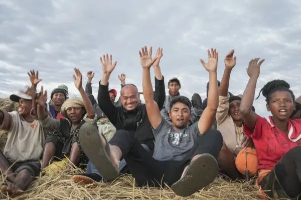 (4月25日,马达加斯加马义奇杂交水稻高产示范基地,湘企专家和当地农民一起庆祝丰收。辜鹏博 王珏 摄)