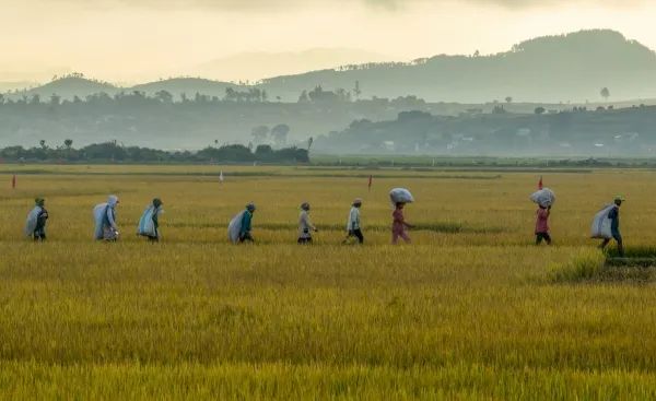 (4月26日清晨,马达加斯加马义奇杂交水稻高产示范基地,农民踏着朝霞,带着农具,走在丰收的田埂上。辜鹏博 王珏 摄)
