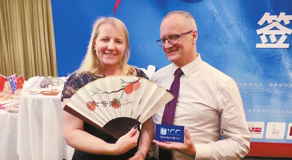 澳洲夫妇Dianne与Tony深深沉浸在湘菜魅力中,他们爱上了品鉴宴上的中国画扇等东方元素,更爱上了来自湖南的中式点心:“品鉴宴上的氛围太好了,让我们都觉得像是来到了湖南,我们都特别喜欢湖南菜的味道。”
