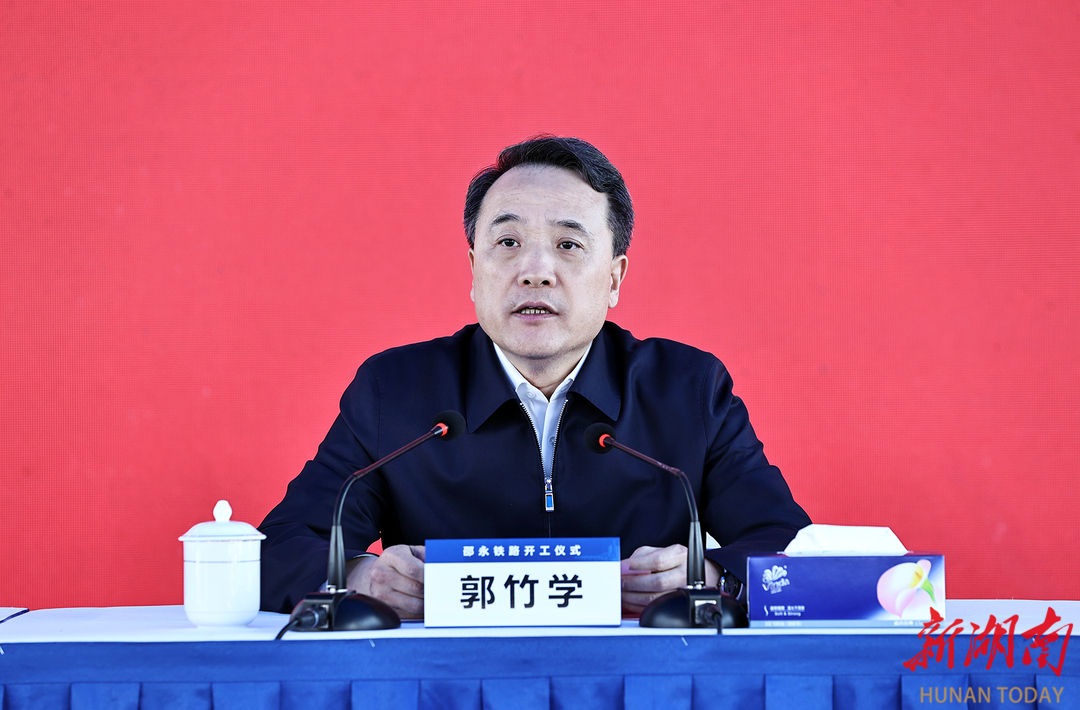 郭竹学对湖南铁路事业发展取得的成就表示祝贺。他说,近年来,湖南铁路发展日新月异,路网规模实现了同步跃升,目前全省铁路营业里程达6079公里,其中高速铁路2501公里、居全国前五位,实现全省“市市通高铁”、三湘大地“高铁成环”。此次开工建设的邵永高铁是国家“八纵八横”高铁网的重要组成部分,建成后将有利于湖南更好发挥“一带一部”优势,全面融入粤港澳大湾区、对接北部湾城市群,推进高水平对外开放;有利于湘南湘西开辟承接产业转移新通道,实现区域经济均衡高质量发展。希望各参建单位和全体建设者始终坚持安全第一,高标准、高质量、高效率推进工程建设,将邵永高铁建成安全工程、精品工程、廉洁工程、群众满意工程,为今后安全高效运营奠定坚实基础,为促进湖南经济社会发展作出新的更大贡献。