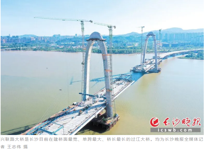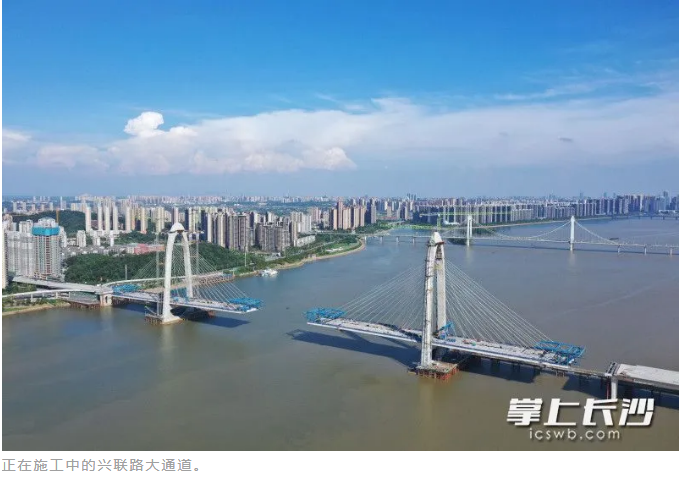 兴联路大通道项目由长沙市交通投资控股集团有限公司投资建设、中交一公局集团有限公司承建。该项目跨望城区和开福区,起于银杉路以西,止于京广铁路桥西,全长5.475公里,主线桥全长4.96公里,跨湘江主桥为双塔斜拉桥,主跨380米,是长沙目前在建桥面最宽、单跨最大、桥长最长的过江大桥。