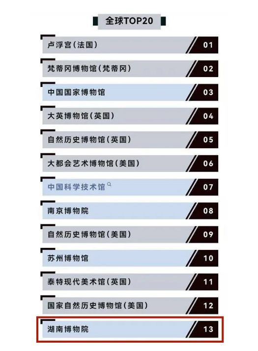 报告显示,中国共7家博物馆上榜全球前20,包括:中国国家博物馆、中国科学技术馆、南京博物院、苏州博物馆、湖南博物院、湖北省博物馆、广东省博物馆。湖南博物院位列第13位。
