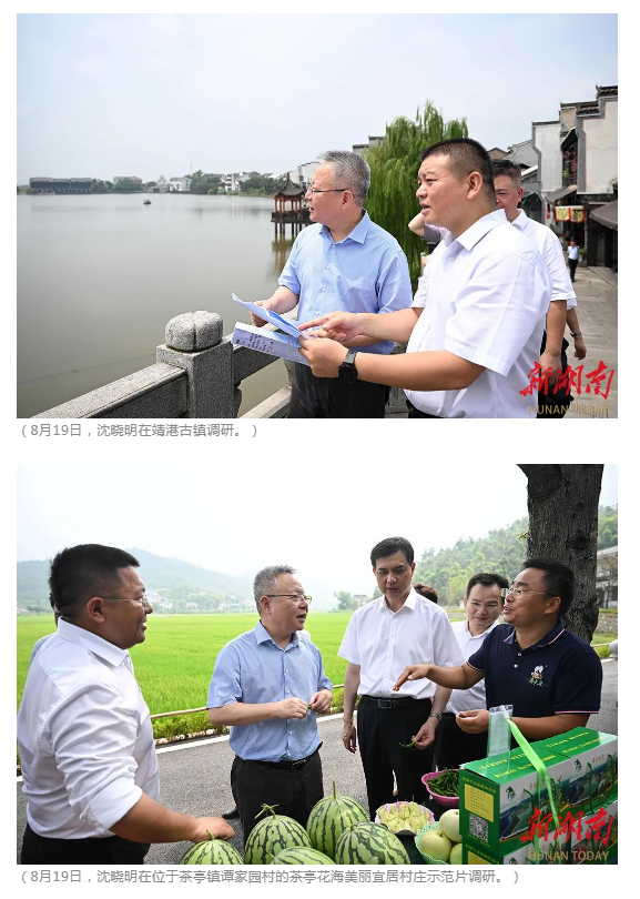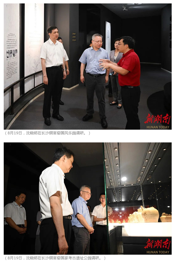 在长沙市望城区,沈晓明先后察看了铜官窑国风乐园、铜官窑国家考古遗址公园、靖港古镇,详细了解主题乐园建设运营、陶瓷文化带动旅游业发展、传统建筑保护利用等情况。沈晓明还来到位于茶亭镇谭家园村的茶亭花海美丽宜居村庄示范片,了解乡村旅游、群众增收等情况。