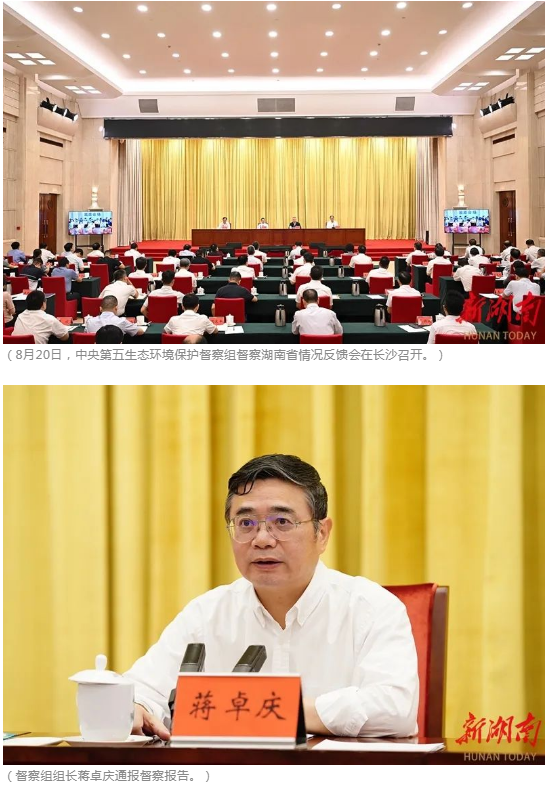 8月20日,中央第五生态环境保护督察组督察湖南省情况反馈会在长沙召开。督察组组长蒋卓庆通报督察报告,省委书记沈晓明作表态发言,省委副书记、省长毛伟明主持。督察组副组长翟青及督察组有关人员出席。