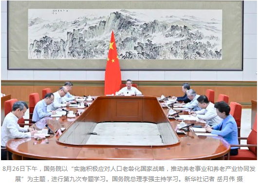 新华社北京8月26日电 8月26日下午,国务院以“实施积极应对人口老龄化国家战略,推动养老事业和养老产业协同发展”为主题,进行第九次专题学习。国务院总理李强在主持学习时强调,要深入学习贯彻习近平总书记关于老龄工作的重要指示精神,按照党中央决策部署,认真落实积极应对人口老龄化国家战略,把积极老龄观、健康老龄化理念融入经济社会发展全过程,加强和改进老龄工作,推动老龄事业高质量发展。