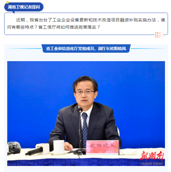 感谢这位记者的提问。省委、省政府高度重视工信领域设备更新和技术改造,省财政厅、省工信厅、省地方金融管理局、人民银行湖南省分行等4部门联合印发《湖南省工业企业设备更新和技术改造项目融资补贴实施办法》。该文件可在省工信厅官网查询,主要有两个突出特点: