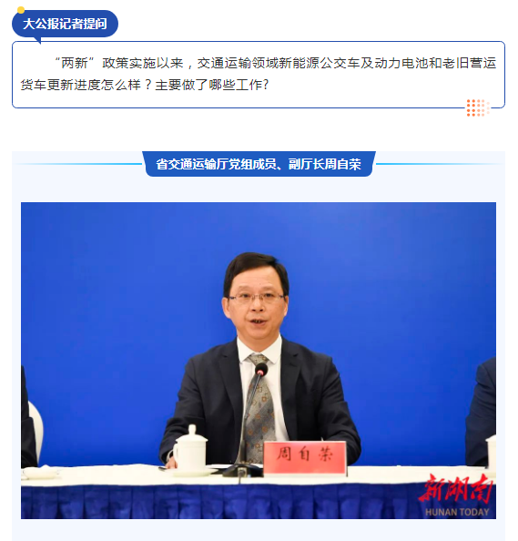 “两新”政策实施以来,截至目前,湖南省已更新能源城市公交车更换动力电池28套,淘汰更新老旧营运货车97台。主要做了以下工作: