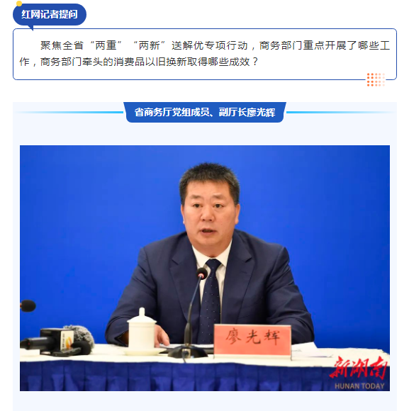 四是抓政策细化。落实国家一揽子增量政策的同时,紧跟国家政策走向,分领域尽快制定出台实施细则。中央安排的超长期专项国债消费品以旧换新资金使用率已超40%,我省进度居全国前列。下一步我们将加大对以旧换新工作的支持,继续按进度拨付,落实中央配套要求。后续若中央进一步加大政策支持力度,我们将通过省财政新增预算安排,并统筹省级相关专项资金,加快落实省级财政配套,支持推进消费品以旧换新,重点支持消费需求较大的汽车和家电消费,延长以旧换新举办时间,让消费者更有获得感。