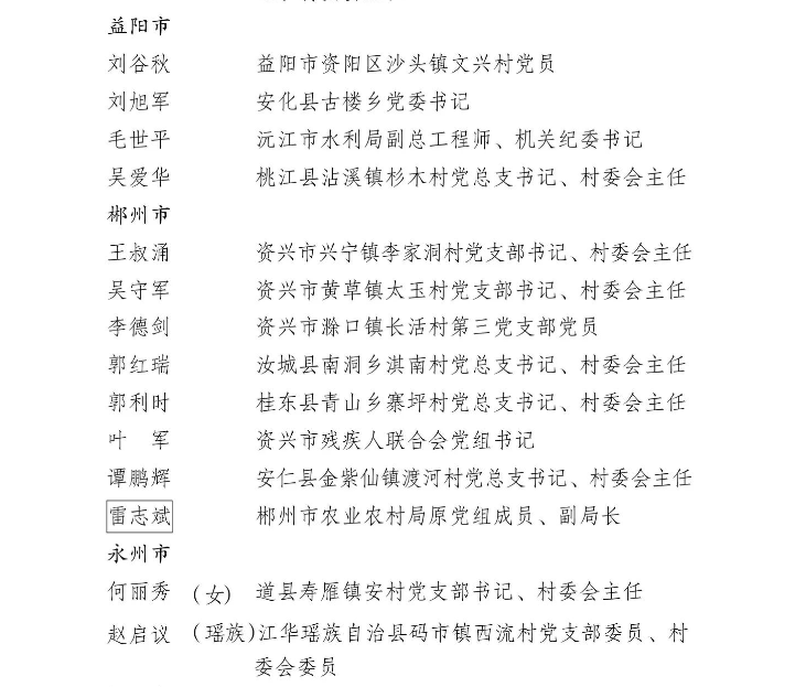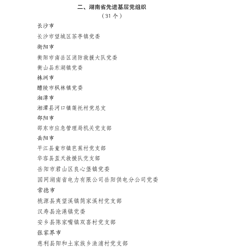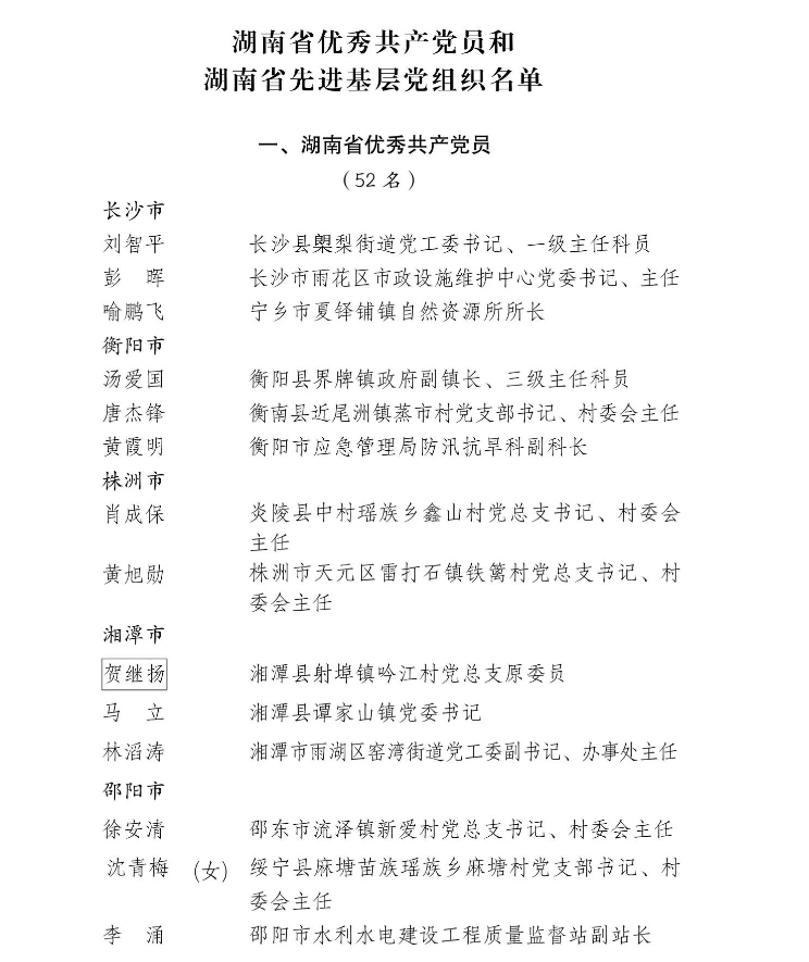 为激励先进、鼓舞士气,省委决定,授予刘智平等49名同志“湖南省优秀共产党员”称号,追授李东、贺继扬、雷志斌同志“湖南省优秀共产党员”称号,授予长沙市望城区茶亭镇党委等31个基层党组织“湖南省先进基层党组织”称号。