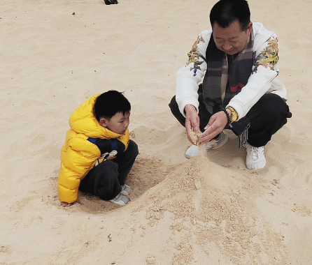 傍晚时分,我们来到湖边的沙滩上。量量迫不及待地脱下鞋子,踏入细软的沙子中,留下一串串欢快的脚印。我紧随其后,感受着沙子的温暖与湿润。我们一起玩起了堆沙堡的游戏,量量用小手铲起沙子,堆成一个个小小的沙堡,我则在一旁帮忙加固,还时不时地给这些沙堡添上几片树叶作为装饰。夕阳的余晖洒在我们身上,将我们的影子拉得长长的,与沙滩上的沙堡一起构成了一幅温馨的画面。