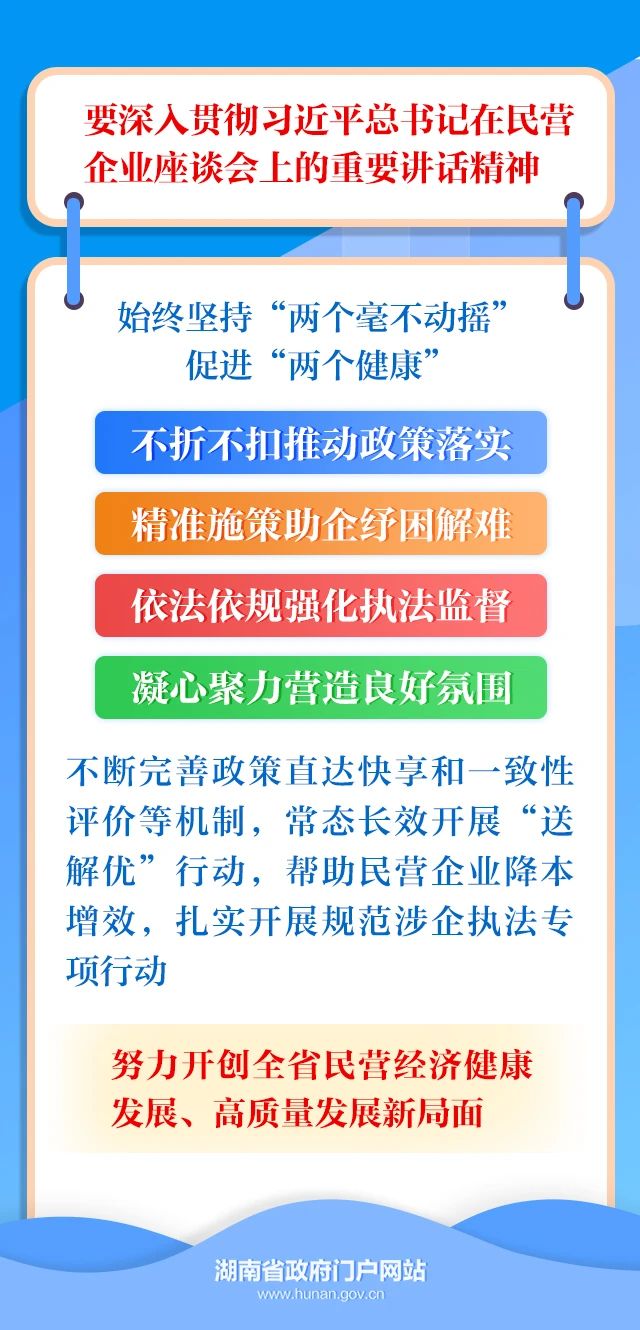 要深入贯彻习近平总书记在民营企业座谈会上的重要讲话精神,始终坚持“两个毫不动摇”,促进“两个健康”,不折不扣推动政策落实,精准施策助企纾困解难,依法依规强化执法监督,凝心聚力营造良好氛围,不断完善政策直达快享和一致性评价等机制,常态长效开展“送解优”行动,帮助民营企业降本增效,扎实开展规范涉企执法专项行动,努力开创全省民营经济健康发展、高质量发展新局面。