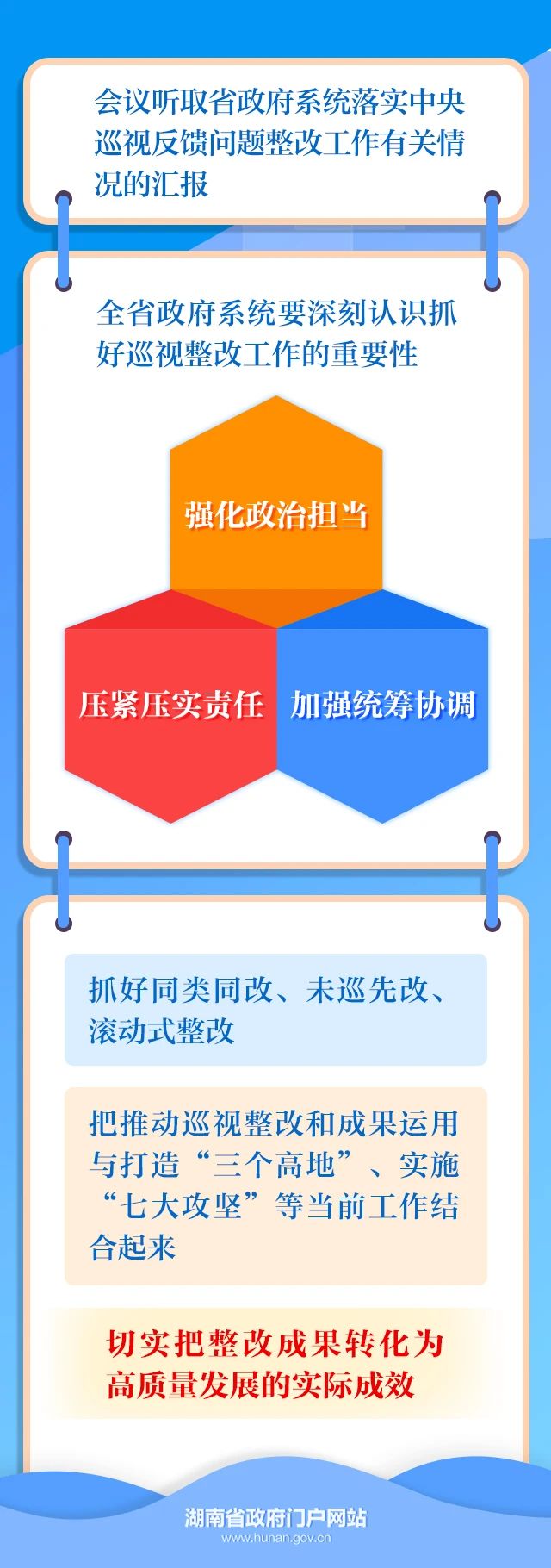 全省政府系统要深刻认识抓好巡视整改工作的重要性,强化政治担当、压紧压实责任、加强统筹协调,抓好同类同改、未巡先改、滚动式整改,把推动巡视整改和成果运用与打造“三个高地”、实施“七大攻坚”等当前工作结合起来,切实把整改成果转化为高质量发展的实际成效。