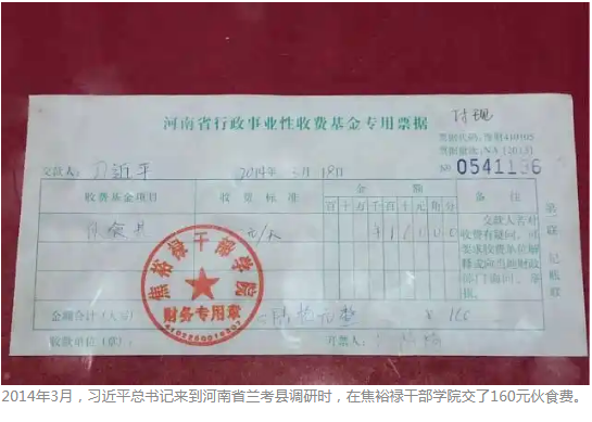 饭碗里,盛着党心民心。有几张菜单、票据:2012年考察河北阜平县的晚餐菜单、2014年考察河南兰考县的餐费收据、2015年在梁家河乡亲梁玉明家的午餐收条……四菜一汤,都是普通家常菜,这就是一位领袖的日常。