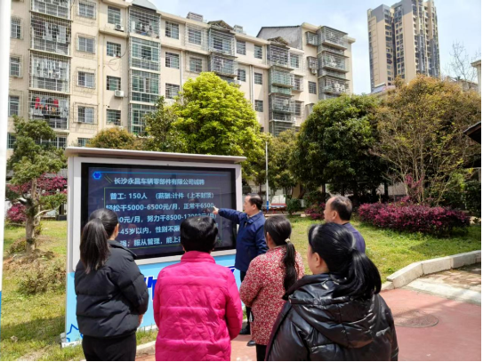 在新屋岭社区党群服务中心入口处设置了就业微市场岗位信息发布区,电子屏上滚动播放招聘信息,社区求职微信群也会及时转发最新岗位信息。“我们不仅帮居民找工作,还能帮企业解决‘招工难’。”李志明说。