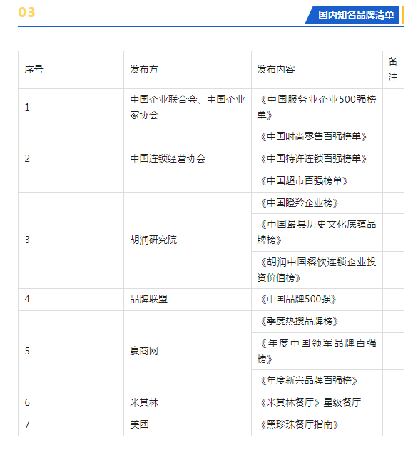 2.国内知名品牌:(1)原则上近5年须入选包含但不限于《国内知名品牌清单》(附表)内权威机构或单位发布的品牌榜单之一,并获得全国性媒体平台或知名时尚媒体对该品牌宣传5次以上。(2)品牌须在湖南省以外的3个(含)以上省份的省会城市或副省级城市(及以上)开设3家(含)以上实体门店,并获得全国性媒体平台或知名时尚媒体对该品牌宣传5次以上;(3)商务部发布的中华老字号名单,各省发布的省级老字号名单。(以上条件满足其一即可)