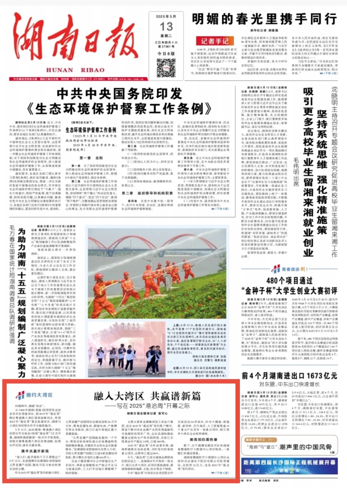 5月13日,2025湖南-粤港澳大湾区经贸合作交流会(以下简称“港洽周”)正式开幕。湖南积极把握新一轮对外开放契机,深度对接粤港澳大湾区发展战略,拓展合作空间,谋求共赢发展。