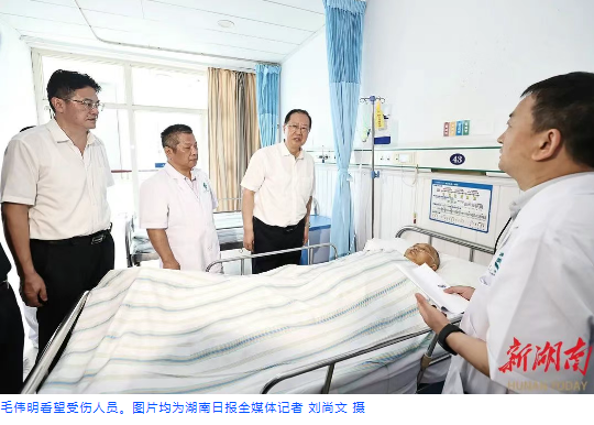 在常德市第一人民医院,毛伟明走进病房看望伤员,叮嘱他们安心养病,要求把全力抢救伤员生命安全放在首位,统筹调度好省市医疗资源,“一人一方案”开展针对性救治,争取受伤人员早日康复。