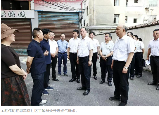 毛伟明一行走进小区,现场查看了解问题成因。他说,燃气入户是事关百姓幸福生活的“身边小事”,也是检验党委政府为民服务能力的“心头大事”。要加快工程建设进度,提升智慧监测预警能力,确保管道安装安全、居民用气安全,让百姓家中的燃气通、心气顺。