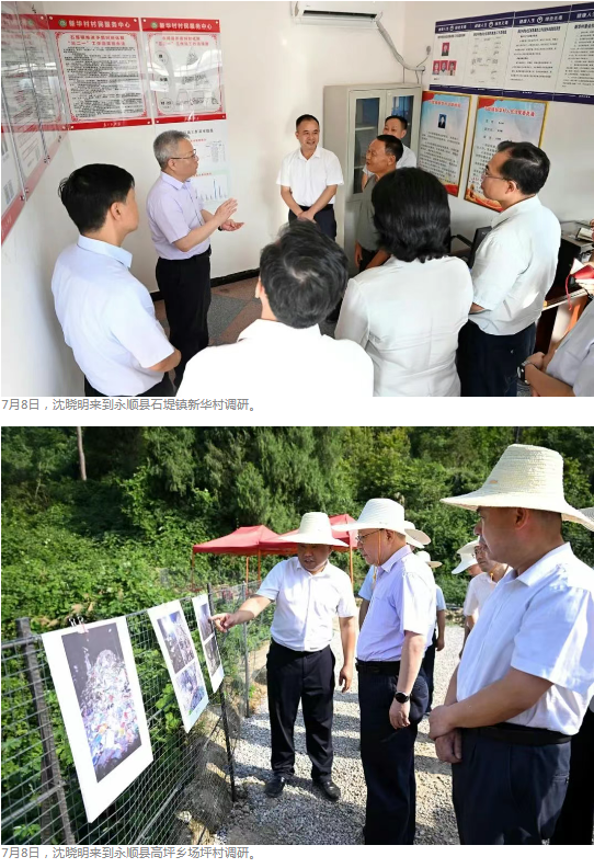 来到泸溪县浦市镇五果溜村,沈晓明察看水稻长势,强调要推进高标准农田建设,提高农民种粮积极性,保障好国家粮食安全。走进永顺县石堤镇新华村,沈晓明重点询问信访工作情况,要求大力化解重复信访积案,积极回应群众诉求。在永顺县高坪乡场坪村,沈晓明察看天坑生活垃圾清理转运情况,要求摸清底数、全面清理,因地制宜做好溶洞后续利用。来到永吉高速团结互通项目现场,沈晓明了解项目推进情况,指出要强化施工安全管理,以便捷交通带动周边地区产业发展和群众增收。