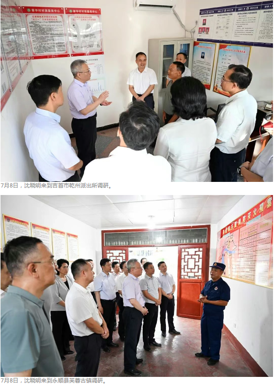 在吉首市乾州派出所,沈晓明了解保障公共安全情况,强调要把安全工作抓紧抓实。走进永顺县芙蓉古镇,沈晓明了解消防体系建设情况,指出要加强消防队伍建设,守护好古镇安全。来到沅陵县交通运输监控指挥中心和客运码头,沈晓明察看视频监控平台,强调要加强安全监管,保障群众出行安全。