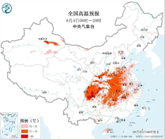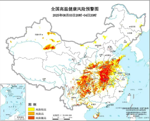 预计,8月3日晚至4日20时,华北西南部、黄淮、江淮中部、江汉、江南西北部、西南地区东部、西北地区中东部及新疆高温健康风险较高(黄色预警);河南、湖北、重庆、贵州、湖南、山东、陕西、四川、安徽、山西、海南、新疆等地的部分地区高温健康风险高(橙色预警),其中,河南大部、湖北中东部、重庆中南部、贵州中部、湖南中部、山东中南部、陕西中部和西南部、四川东部、海南南部、新疆东部等地的部分地区高温健康风险极高(红色预警)。