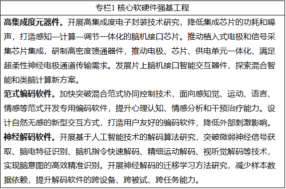 (二)突破关键脑机芯片。发展高通道、高速率脑信号采集芯片,强化模数转换、通道管理和噪声抑制,增强脑信号采集放大能力。研发高性能、超低功耗脑信号处理芯片,强化并行处理能力,推动感知、计算和调节等功能的一体化集成。研发超低功耗、高速率、高可靠的通信芯片,提升脑信号传输和抗干扰能力。