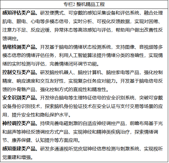 (十六)加强政策支持。加强脑机接口技术攻关和应用示范,推动布局实施一批重大项目,强化协同攻关能力。推动国家制造业转型升级基金、国家中小企业发展基金等加大投入,实施“科技产业金融一体化”专项,发挥国家产融合作平台作用,带动更多资本投入。对植入式脑机接口医疗器械等重点产品加大注册指导,给予优先支持。用好首台(套)、首批次保险补偿政策,加快产业化落地。