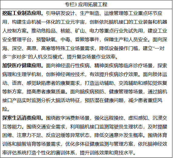到2027年,脑机接口关键技术取得突破,初步建立先进的技术体系、产业体系和标准体系。电极、芯片和整机产品性能达到国际先进水平,脑机接口产品在工业制造、医疗健康、生活消费等加快应用。产业规模不断壮大,打造2至3个产业发展集聚区,开拓一批新场景、新模式、新业态。