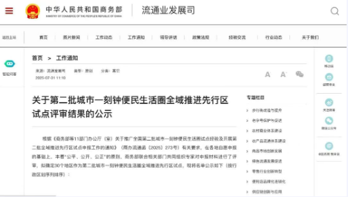 根据《商务部等11部门办公厅(室)关于推广全国第二批城市一刻钟便民生活圈试点经验及开展第二批全域推进先行区试点申报工作的通知》(商办流通函〔2025〕273号)有关要求,在各地自愿申报的基础上,本着“公平、公开、公正”的原则,商务部联合相关部门共同组织专家对申报材料进行了评审,拟确定30个地区作为第二批城市一刻钟便民生活圈全域推进先行区试点,现将名单公示如下(按行政区划序列排序):