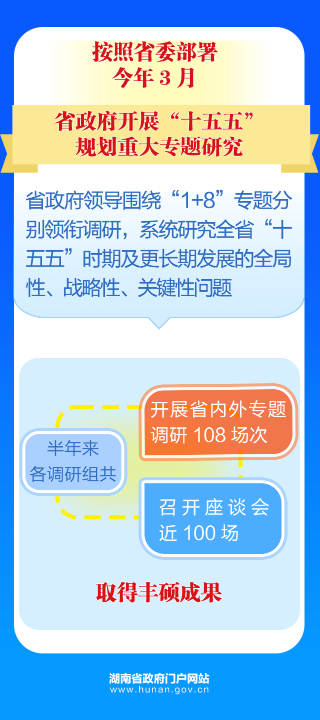 按照省委部署,今年3月,省政府开展“十五五”规划重大专题研究,省政府领导围绕“1+8”专题分别领衔调研,系统研究全省“十五五”时期及更长期发展的全局性、战略性、关键性问题。半年来,各调研组共开展省内外专题调研108场次、召开座谈会近100场,取得丰硕成果。