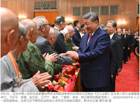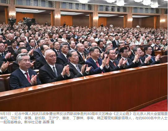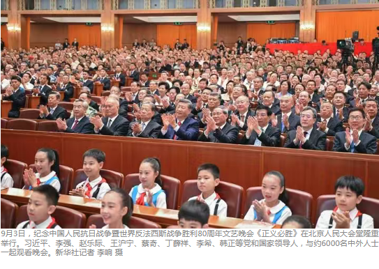 歌声嘹亮,唱响胜利华章;舞姿雄壮,展现正义力量。纪念中国人民抗日战争暨世界反法西斯战争胜利80周年文艺晚会《正义必胜》3日晚在北京人民大会堂隆重举行。习近平、李强、赵乐际、王沪宁、蔡奇、丁薛祥、李希、韩正等党和国家领导人,与约6000名中外人士一起观看晚会,共同纪念这个光辉的日子。