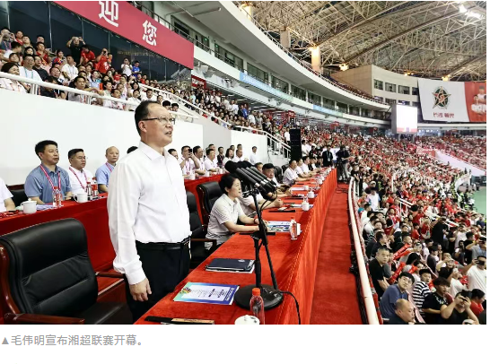 2025湖南省足球联赛(简称“湘超联赛”)开幕式在长沙贺龙体育场举行,省委副书记、省长毛伟明宣布开幕。