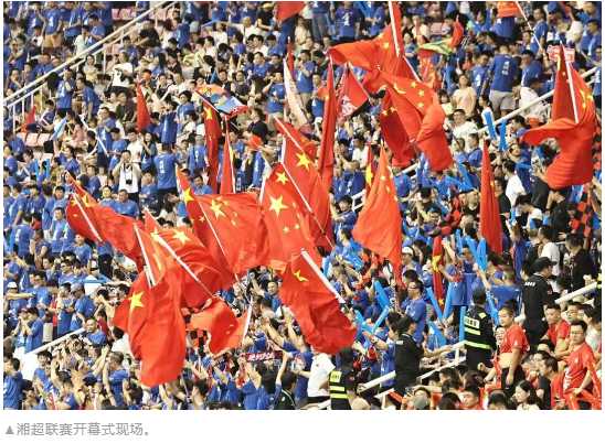 当晚,长沙贺龙体育场山呼海啸,人气爆棚。开幕式上,14支市州球队挥舞着各自的战旗一一亮相,集结于绿茵场上。一场以足球之名的湖湘盛宴,就此拉开序幕。首场比赛在长沙队与娄底队之间展开,经过激烈的角逐,最终,长沙队以2:0赢得了湘超联赛揭幕战的胜利。