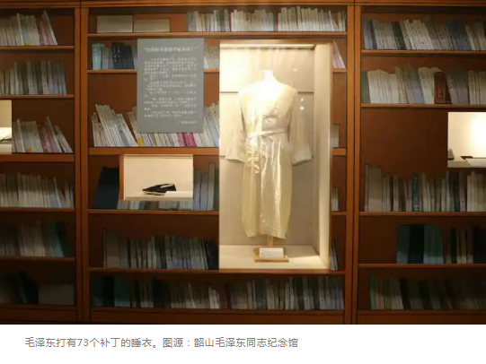 在毛泽东的众多遗物中,有一件物品十分引人注目,那是一件白色泛黄的棉质睡衣。这件睡衣材质一般,样式普通,夹层,香蕉领,外侧有两个口袋,长141厘米。睡衣外观通体破旧,它的领子全换过,衣袖、下摆等处补丁连补丁,竟达73个之多,以至于几乎看不出本布。从20世纪50年代初一直到1971年,毛泽东春秋两季都穿它,这一穿就是20余年。尽管越来越旧,毛泽东却总不舍得扔掉。围绕它的去留更换问题,还发生了许多有趣的故事。