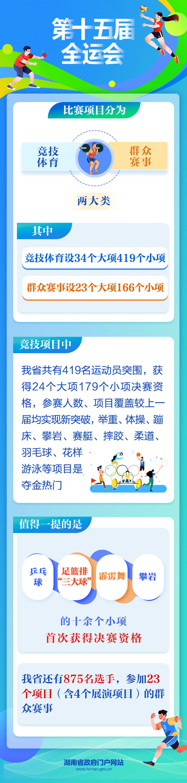 第十五届全运会比赛项目分为竞技体育和群众赛事两大类,其中,竞技体育设34个大项419个小项,群众赛事设23个大项166个小项。竞技项目中,我省共有419名运动员突围,获得24个大项179个小项决赛资格,参赛人数、项目覆盖较上一届均实现新突破,举重、体操、蹦床、攀岩、赛艇、摔跤、柔道、羽毛球、花样游泳等项目是夺金热门。值得一提的是,乒乓球、足篮排“三大球”、霹雳舞、攀岩的十余个小项首次获得决赛资格。另外,我省还有875名选手参加23个项目(含4个展演项目)的群众赛事。