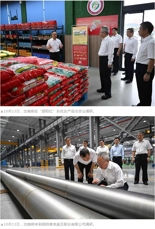 在“邵阳红”名优农产品出货仓,沈晓明察看当地名优农产品展示和工厂生产线,了解“邵阳红”区域公用品牌培育和农产品生产推广情况,指出要持续做好“土特产”文章,培育壮大农业龙头企业,通过线上线下相结合,做大规模、做优品牌。来到邵阳维克液压股份有限公司,沈晓明了解企业生产经营、技术研发等情况,鼓励要加强科技创新,积极开拓市场,持续提升经营效益和市场竞争力。在大祥区蔡锷村,沈晓明详细了解村庄建设管理和产业发展情况,走访了解脱贫监测户生产生活状况。他指出,要持续巩固拓展脱贫攻坚成果同乡村振兴有效衔接,推动农文旅融合发展,做实做强集体经济,用心用情做好生活困难群众兜底帮扶,织密扎牢民生保障安全网。