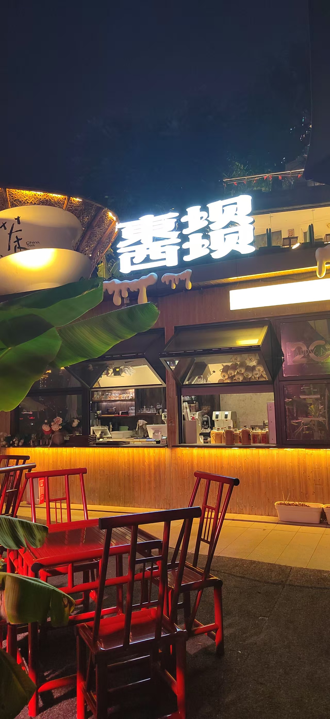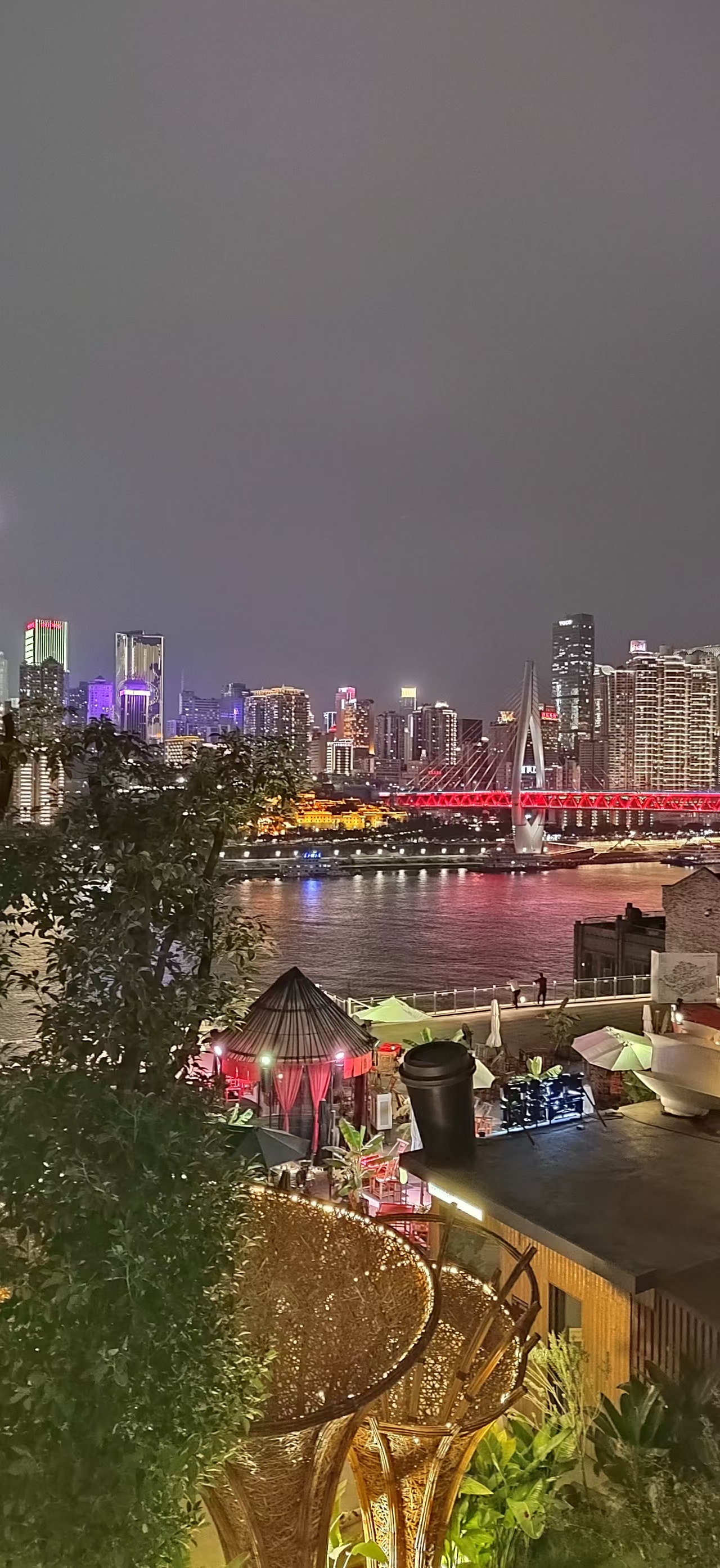 顺着江风再走一段,脚步轻快如飞,忽见梯坎盘旋而上,隐入苍翠的山腰,东西坝坝茶楼就藏在云雾缭绕的地方,竹椅木桌,煮着老荫茶的醇厚回甘。倚栏远眺,整座城在脚下缓缓铺展,洪崖洞的吊脚楼挂着红灯笼串串,轻轨穿楼而过,像一条游动的光带,时而擦过天际,时而又坠入江畔。茶烟袅袅升起,模糊了天地的界限,恍惚间,自己仿佛飘浮在云海之间,下一瞬,又被晚风推回现实的岸边,却仍贪恋这虚实交错的梦幻奇观。