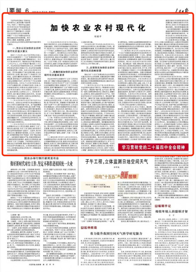 11月6日,《人民日报》要闻版刊发中共中央政治局委员、国务院副总理刘国中的署名文章《加快农业农村现代化》。
